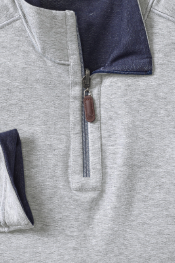 - Quarter-zip placket with logo leather-look pull