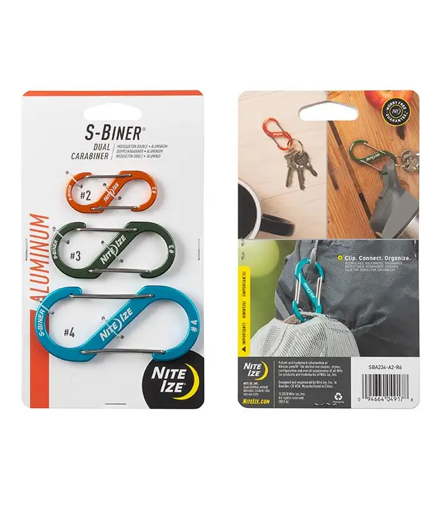 The iconic S-Biner design allows quick and easy attachment using its unique double-gated design. The lightweight and colorful aluminum body with stainless steel gates is available in a variety of sizes creating a perfect way to hold, secure, and connect everything from keys to water bottles to gear.